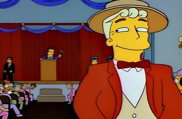 Lyle responds with a chuckle and “Young lady… that’s the most intelligent question I’ve ever been asked”. Lisa responds with a pleased, “Really?” and Lyle sidles up to her to mutter, “Oh, I could give you an answer. But the only ones who’d understand it would be you and me… and that includes your teacher”. Lisa giggles in glee. And the huckster moves on with his scam.