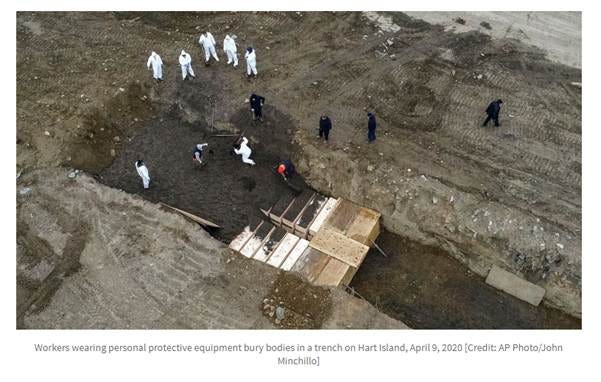 Burials on Hart Island, the city’s burial site for unclaimed bodies for over a century, have gone from 25 a week before the pandemic to about 25 a day—a five-fold increase. Those interred on the island have been unclaimed by any family members and are overwhelmingly poor. The quintupling of burials is due both directly to COVID-19 and indirectly, as every aspect of medical, social and governmental infrastructure gets overwhelmed by the death toll.