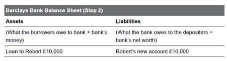 “Upon signing, Barclays records it [the loan] as an asset on its balance sheet. Of course, double entry bookkeeping requires an equal and opposite accounting entry, and besides, Robert now wishes to get access to the money. So Barclays creates a new bank account for him, and gives it a balance of £10,000. This account is a liability of the bank to Robert, so it is recorded on the liabilities side of Barclays’ balance sheet.” [emphasis added]x]