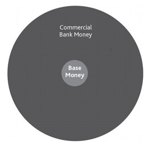To truly understand the total money supply and its impact on the economy, we should visualise the money supply as a small core of ‘base money’, representing central bank reserves available to commercial banks for payment settlement and liquidity, surrounded by a balloon of commercial bank money resulting from credit creation. The latter is the real driver of economic activity. As we shall see when we discuss where money goes in Part II, the use to which commercial bank money is put once it’s created determines the nature of this economic activity.